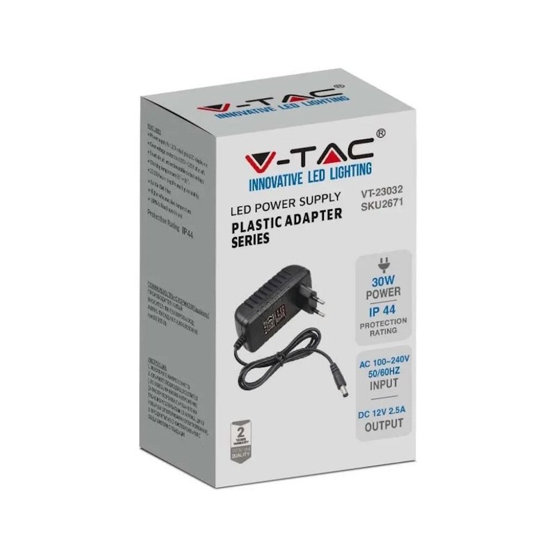 Alimentatore V-Tac Sku 2612 da 12V e 2,5A, adatto per sistemi di videosorveglianza, strip led e Videoregistratori(Dvr). Per i Dvr è consigliato l'utilizzo di questo alimentatore fino ad un massimo di 2TB.