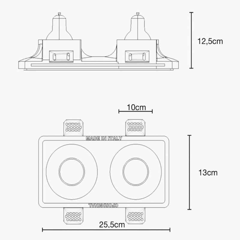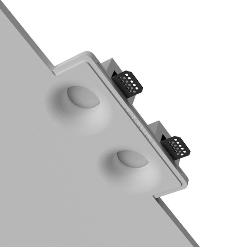 Porta faretto in gesso ceramico tipo di installazione ad incasso. Alette regolabili su diversi spessori.
