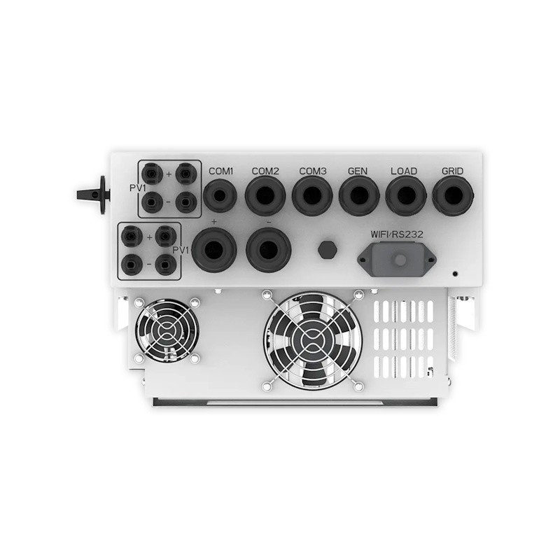 Include 2 MPPT a doppia stringa (150–425V) con potenza in ingresso fino a 12.8kW. Wi-Fi e TA inclusi. Dotato di schermo touch LCD a colori.