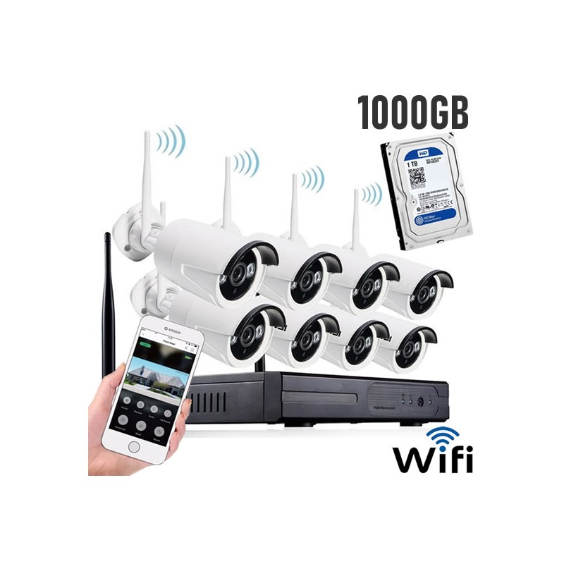 kit videosorveglianza WiFi 8 telecamere, completo di 1 decoder NVR da 8 canali, 1 Hard Disk da 1000gb, 1 alimentatore DVR, 1 Mouse, 8 telecamere da 2mpx e 8 alimentatori telecamere.