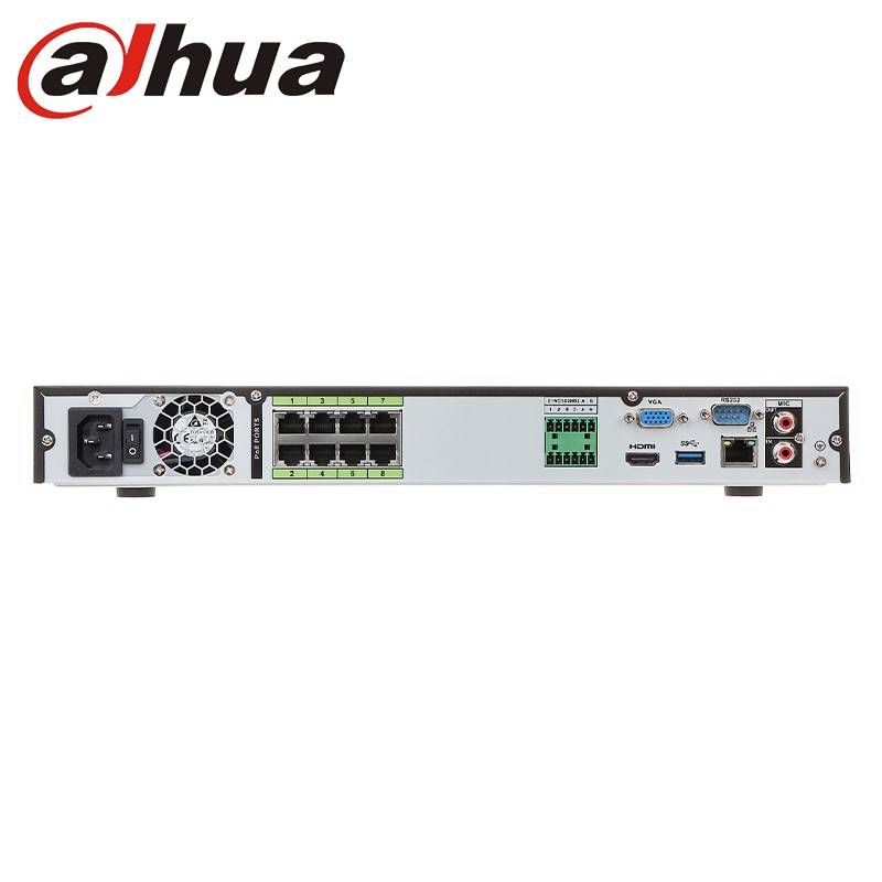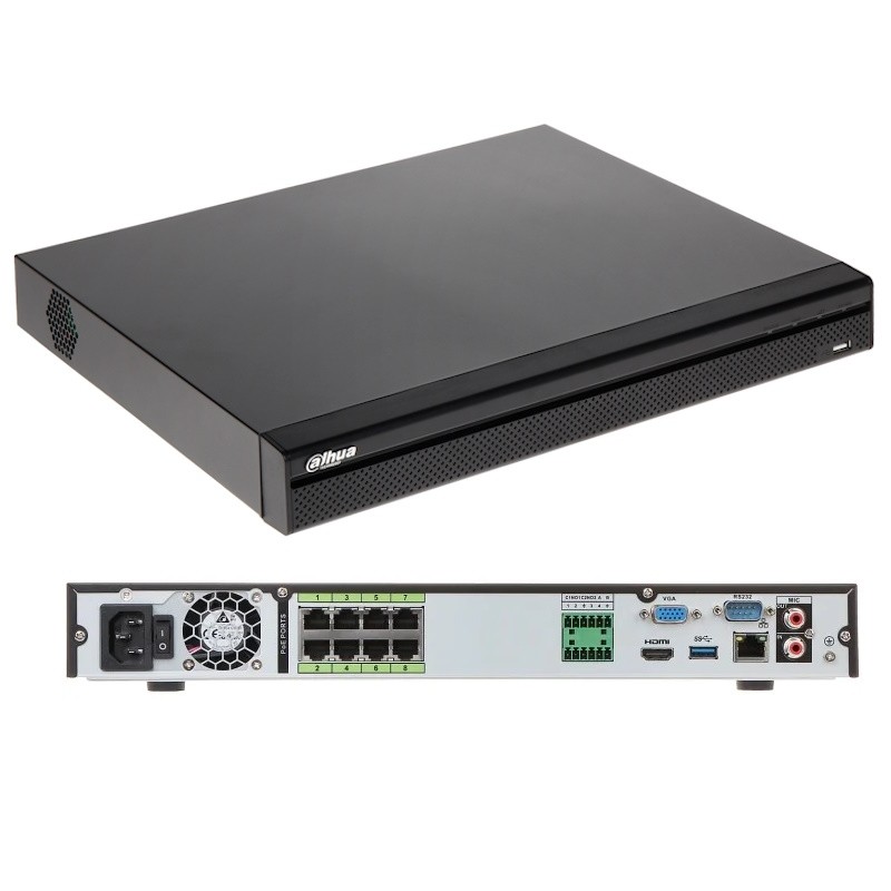 Videoregistratore Nvr Dahua modello NVR5208-8P-4KS2E , con risoluzione in ultra HD 4k e 8 canali Ip PoE. Provvisto di protocollo di compatibilità Onvif e una compressione video h.265+. Possiede due porte video: HDMI e VGA, supporto di 2 hard disk fino ad un massimo di 10TB.