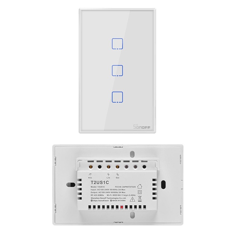 Interruttore Sonoff con 3 pulsanti touch, modello TX-T2-US-3C, monitorabile da remoto tramite apposita app installabile su smartphone o tablet. Supporta anche il telecomando 433 MHz. Inoltre è possibile condividere il controllo dei dispositivi con altri utenti, consentendo ai membri di controllare in modo efficiente tutti i dispositivi connessi al sonoff.