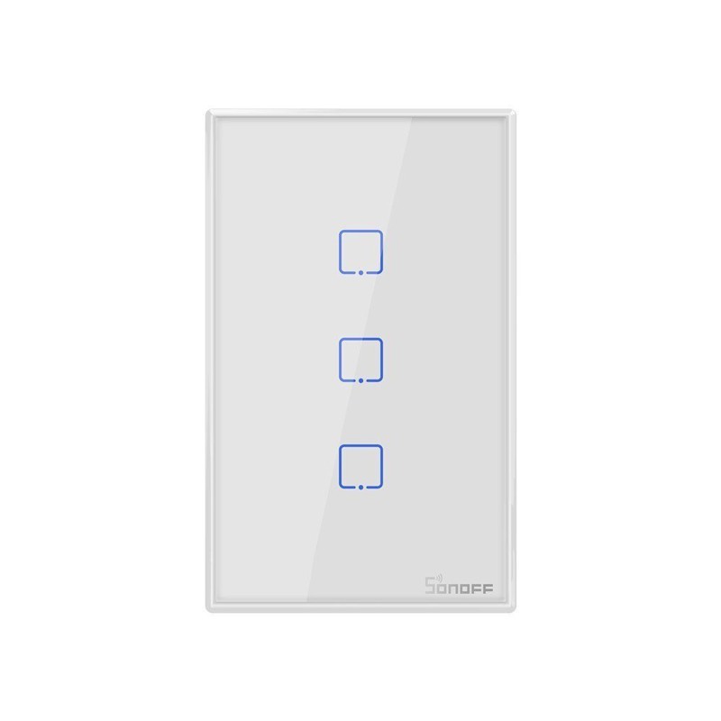 Interruttore Sonoff con 3 pulsanti touch, modello TX-T2-US-3C, monitorabile da remoto tramite apposita app installabile su smartphone o tablet. Supporta anche il telecomando 433 MHz.