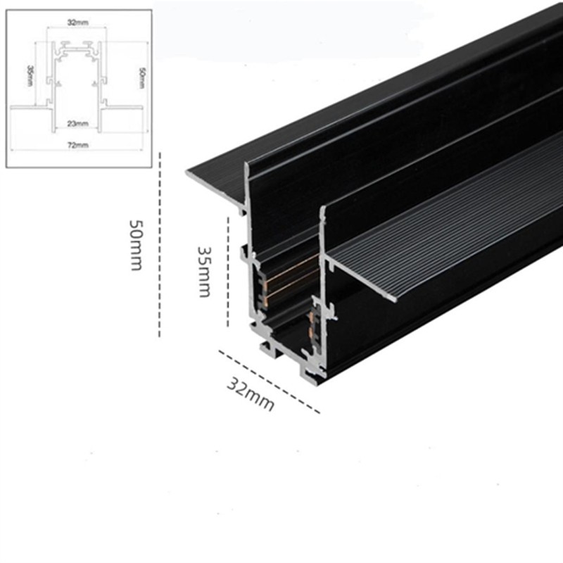 Binario magnetico da 48v ad incasso a scomparsa e a bassa tensione modello BIN-INC-1M , il suo design ad incasso permette di occupare uno spazio compatto e ridotto, rendendo gli spazi puliti ed eleganti.