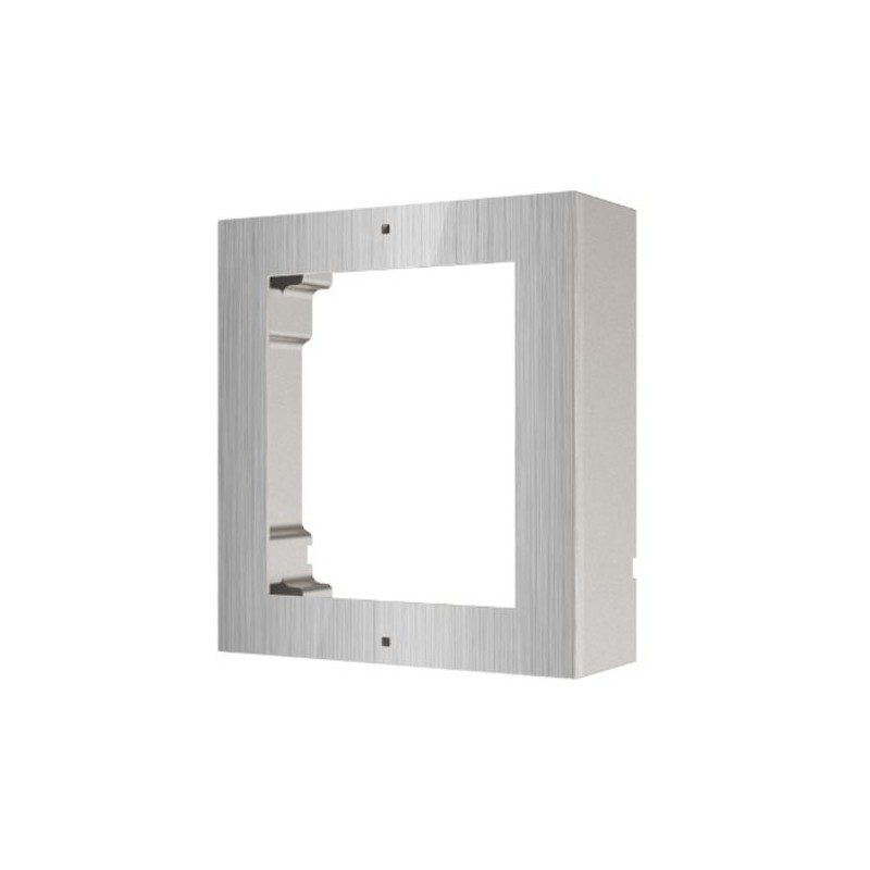Hikvision Cornice a parete in acciaio inox 1 modulo DS-KD-ACW1 S. Questo telaio da parete è progettato appositamente per il montaggio del videocitofono IP Hikvision di seconda generazione. Realizzato in lega di alluminio di alta qualità, garantisce un montaggio sicuro ed estetico per un singolo modulo.