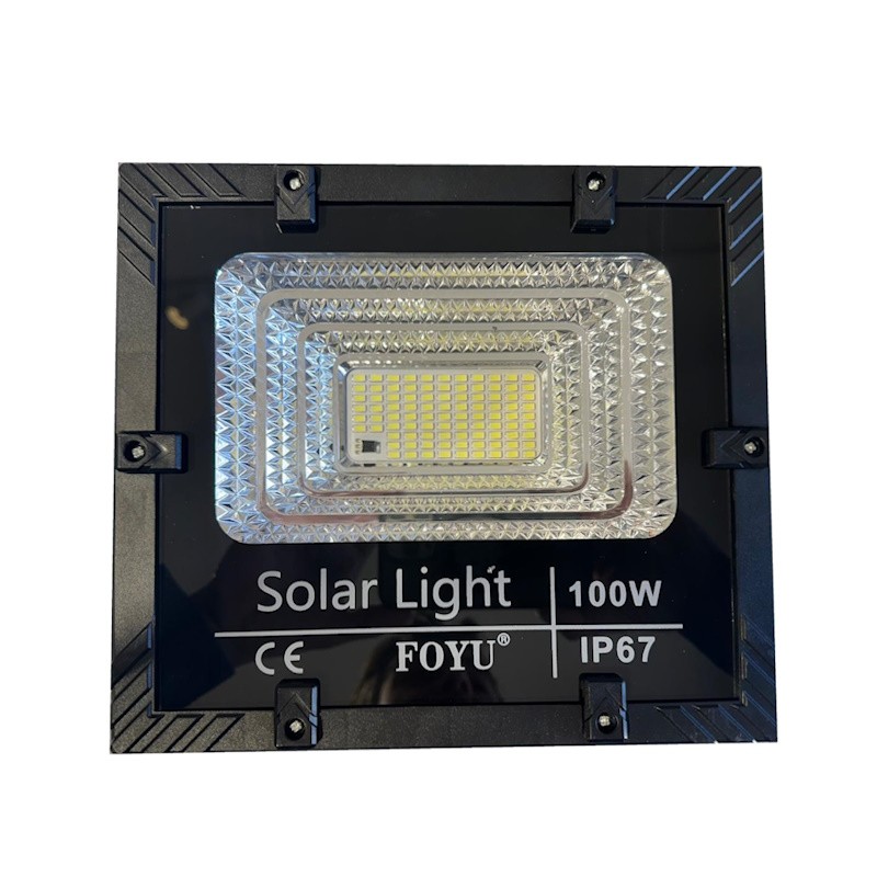 Faro solare LED da 100w provvisto di pannello solare e con sensore crepuscolare per l'accensione automatica quando cala il buio. Ideale per gli ambienti esterni, con un raggio di illuminazione ampio, provvisto di telecomando. Durata batteria (dichiarata) se completamente carico: 12-24 ore.