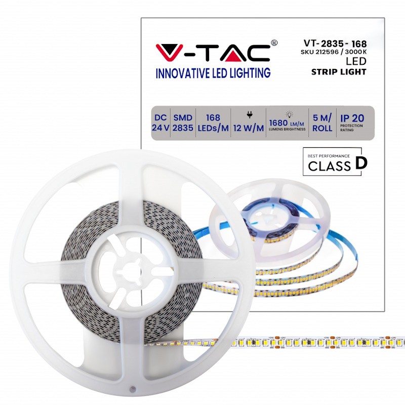 V-TAC Strip LED SMD2835 12W/m 5m 168 LED/m 140LM/W 24V 3000K IP20 10mm sku 212596