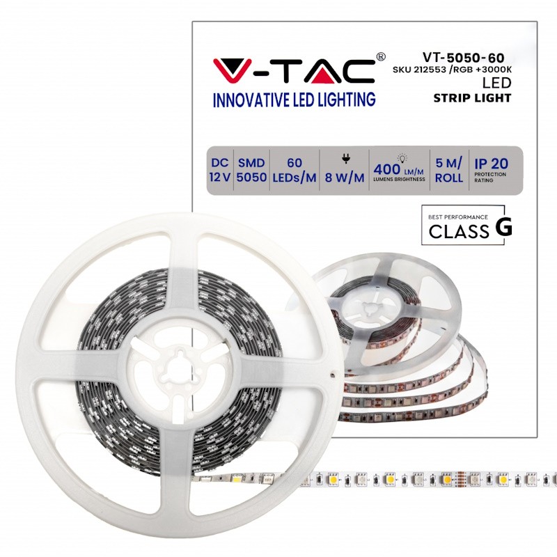 V-TAC Strip LED SMD5050 8W/m 5m 60 LED/m 12V RGB + 3000K IP20 10mm sku 212553