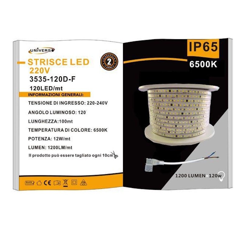 Strisce Led Per Esterno 220v 8W Led 3535 120 Led Al Metro 8MM 6500K