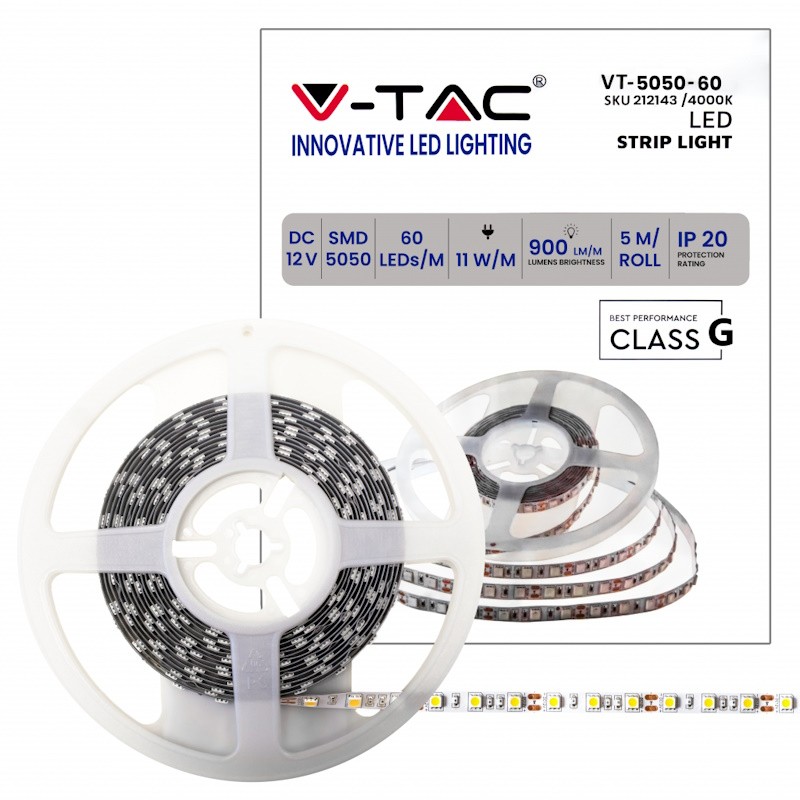 V-TAC Strip LED SMD5050 11W/m 5m 60 LED/m 12V 4000K IP20 10mm